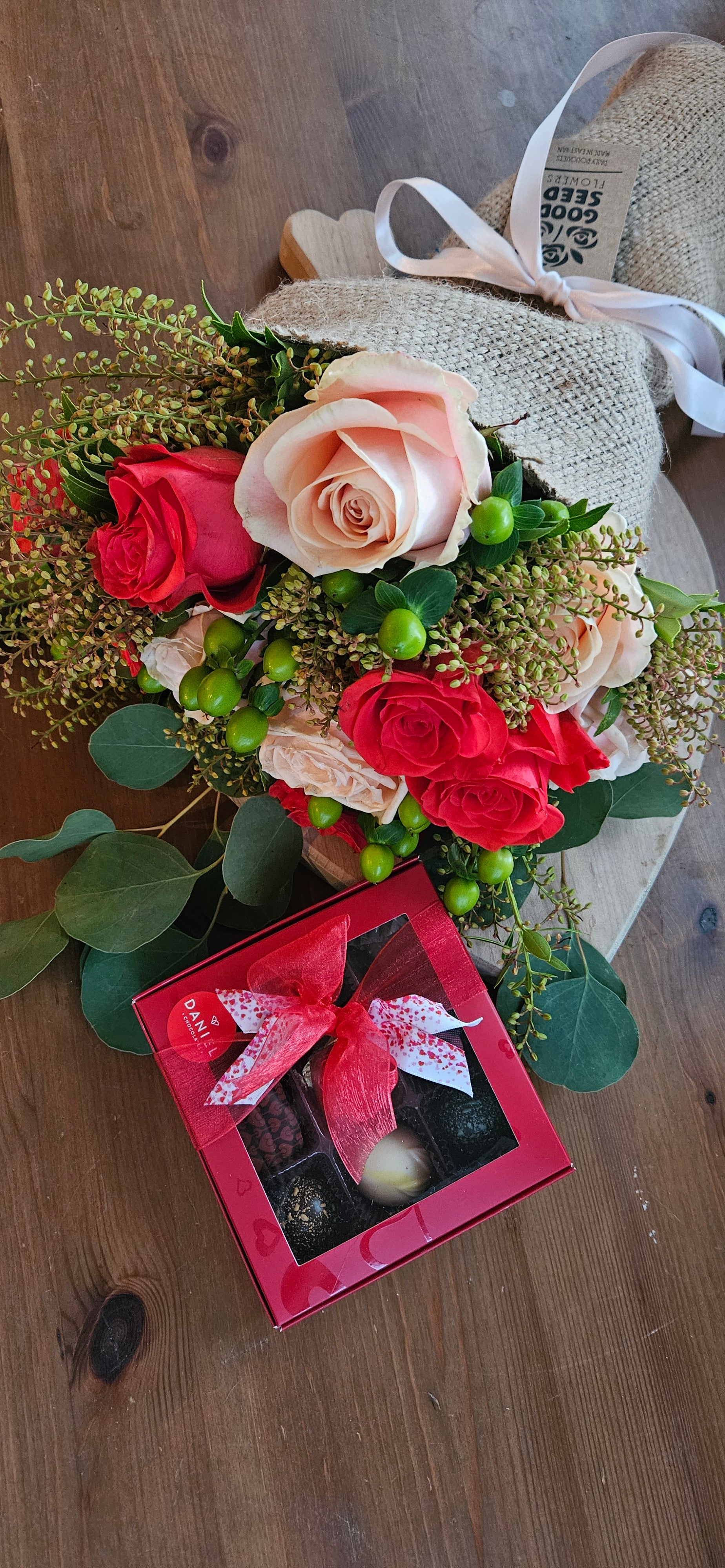 A fresh bouquet of stunning red and pink roses for your loved one. Make Valentine's Day special with locally grown roses, surrounded by a bed of greenery and wrapped in burlap for a whimsical and romantic vibe!
